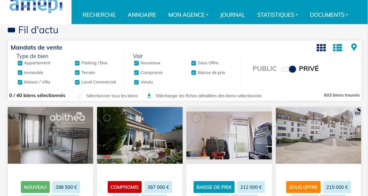 Désormais, lors des connexions quotidiennes à l’outil du Fichier AMEPI, les membres AMEPI trouveront dans la première page le « Fil d’actualité » : les nouveaux mandats, les baisses de prix, les changements d’état (sous offre, compromis et vendu).
